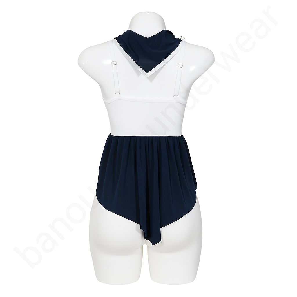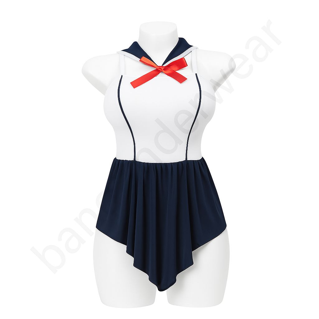 - شامل بادی با یقه ملوانی، پاپیون قرمز و دامن سورمهای نامتقارن