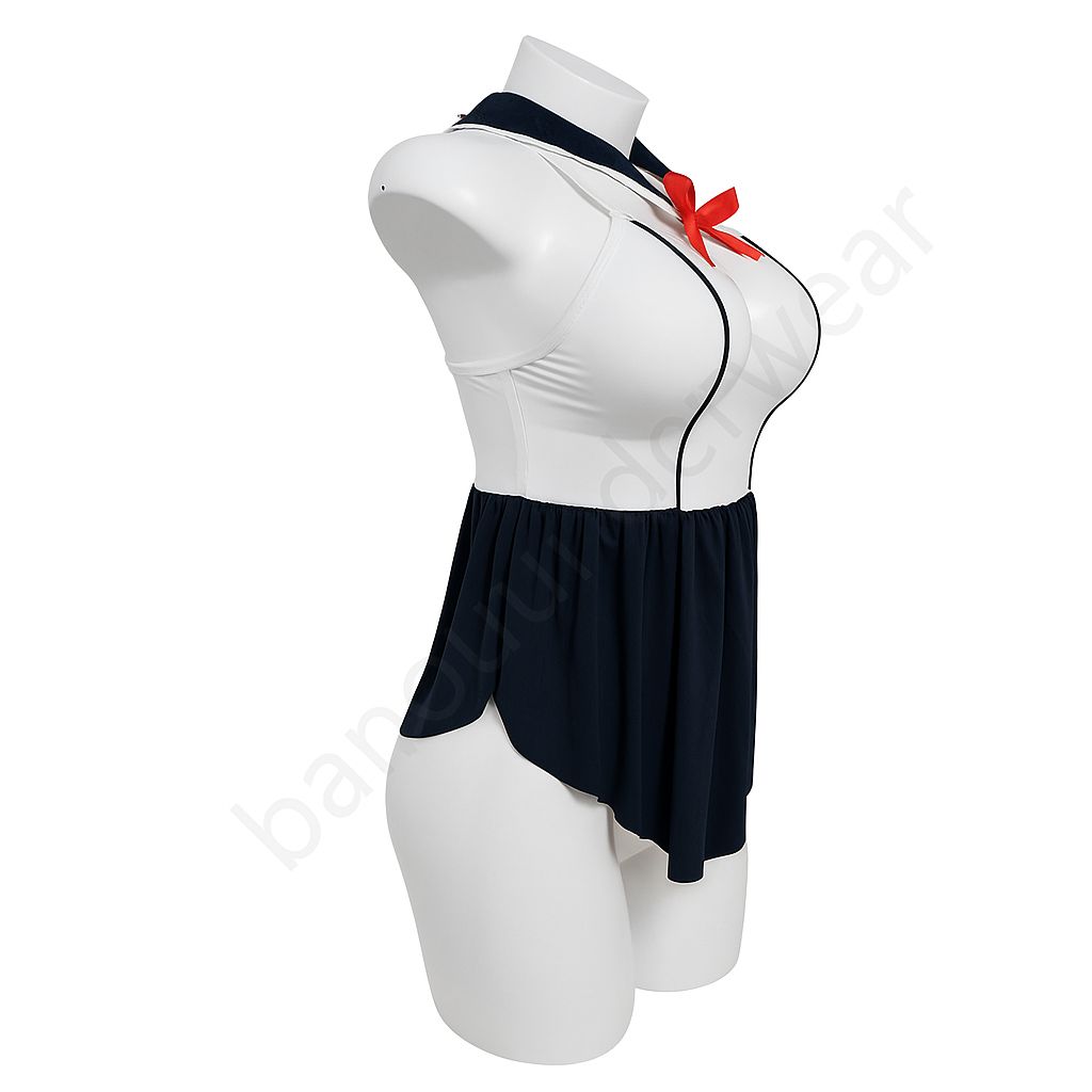 این ست شامل بادی دکلته بدون آستین به رنگ سفید با خطوط دوخت مشکی، یقه ملوانی سورمهای تزئینشده با پاپیون ساتن قرمز، و دامنی نامتقارن با جنس نرم و خوشفرم میباشد. طراحی جریاندار دامن، حرکت ظریف و اغواگری به استایل شما میبخشد و حس ماجراجویی فانتزی را کامل میکند.